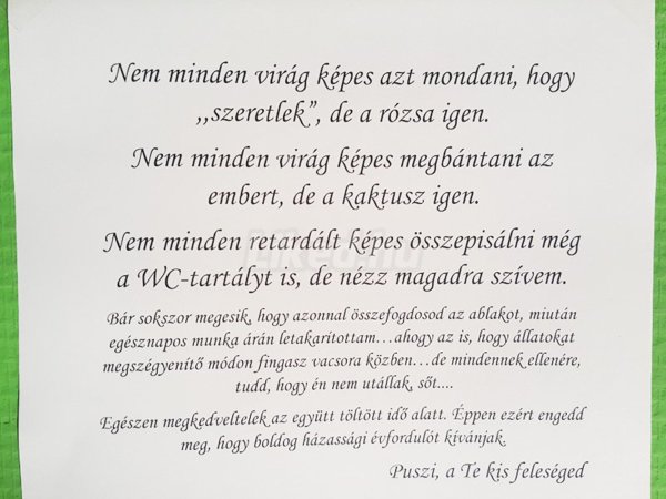 12. 10. (!) házassági évfordulónk alkalmából ezt a meglepetést hagyta nekem hálószobánk falán a feleségem.