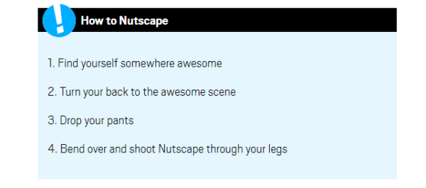 Ha szeretnél beszállni a mókába, máris mondom a részleteket. Szóval, az utazásnak egy bizonyos pontján, amikor lélegzetelállító szépségű tájat látsz, már csak egy dolgod van hátra. Kapd elő a golyóidat és lógasd a táj elé. Majd hajolj előre és a lábaid között lődd el a képet. Ha elég ügyes vagy, a zacsi fenséges holdként is feltűnhet az égen.
