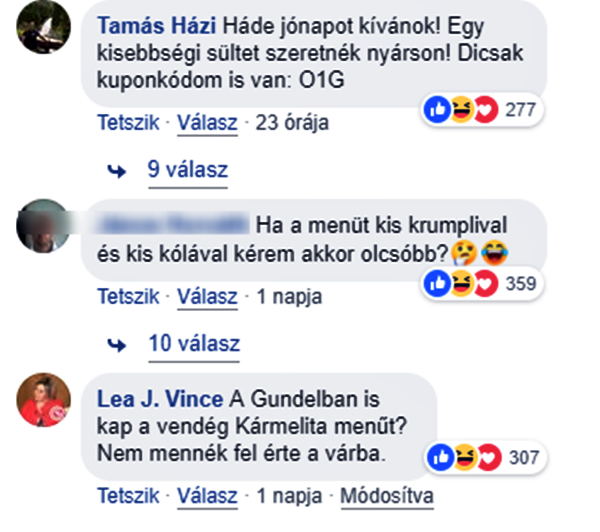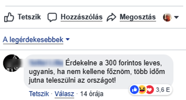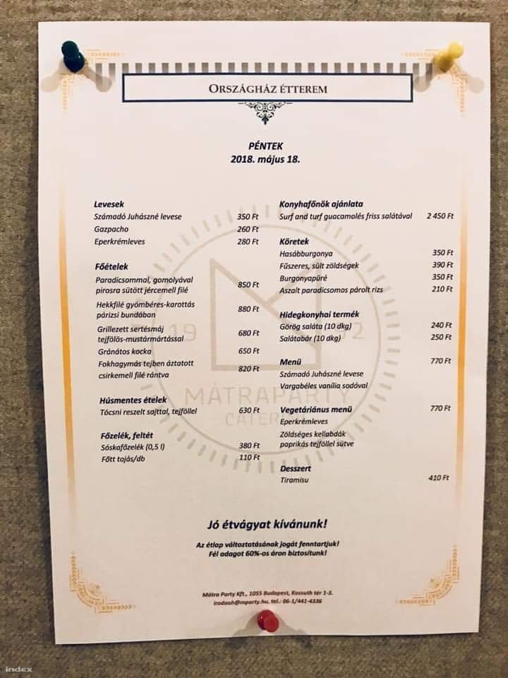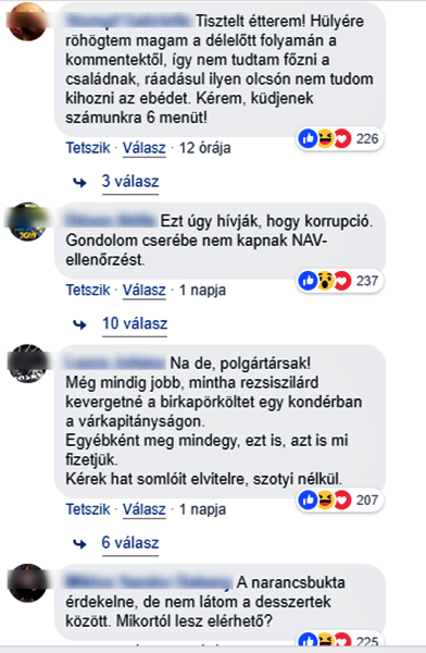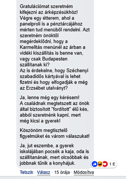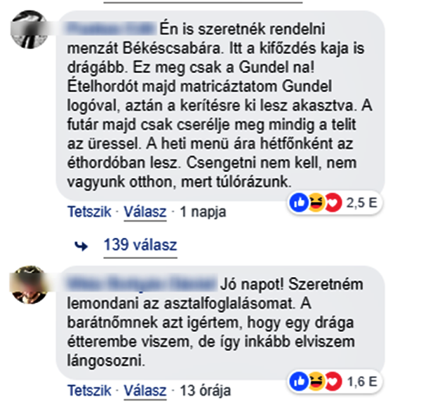 Mint az már köztudott, a Gundel fogja üzemeltetni a Miniszterelnökség menzáját. A megbízást tenderen nyerték el. A hír közzétételét követően a Miniszterelnökség gyorsan küldött is egy fotót a hírt megíró hvg-nek, amiből kiderült, hogy a Gundel kifejezetten kedvező áron táplálja majd dolgozóikat. Például 300 forint egy füstölt csülkös bableves, 240 forint egy saláta, míg például a roston csirkemell 900 forint. Míg a városligeti étteremben te meg én 2700 forintért burkolhatunk egy somlói galuskát, addig a Miniszterelnökség menzáján kevesebb mint tizedannyiért, mindössze 260 forintért fogják az ott dolgozók! (Ja, hogy el ne felejtsük, a ligetben még 12,5 százalék felszolgálási díjat is fizetünk érte.) Szóval igen, a civilek is képbe kerültek, és hát nem is rejtették véka alá az érzéseiket ezzel kapcsolatban. Tették mindezt a Gundel facebook oldalán. Random választanak az étterem fotói közül és alatta véleményeznek boldogan.